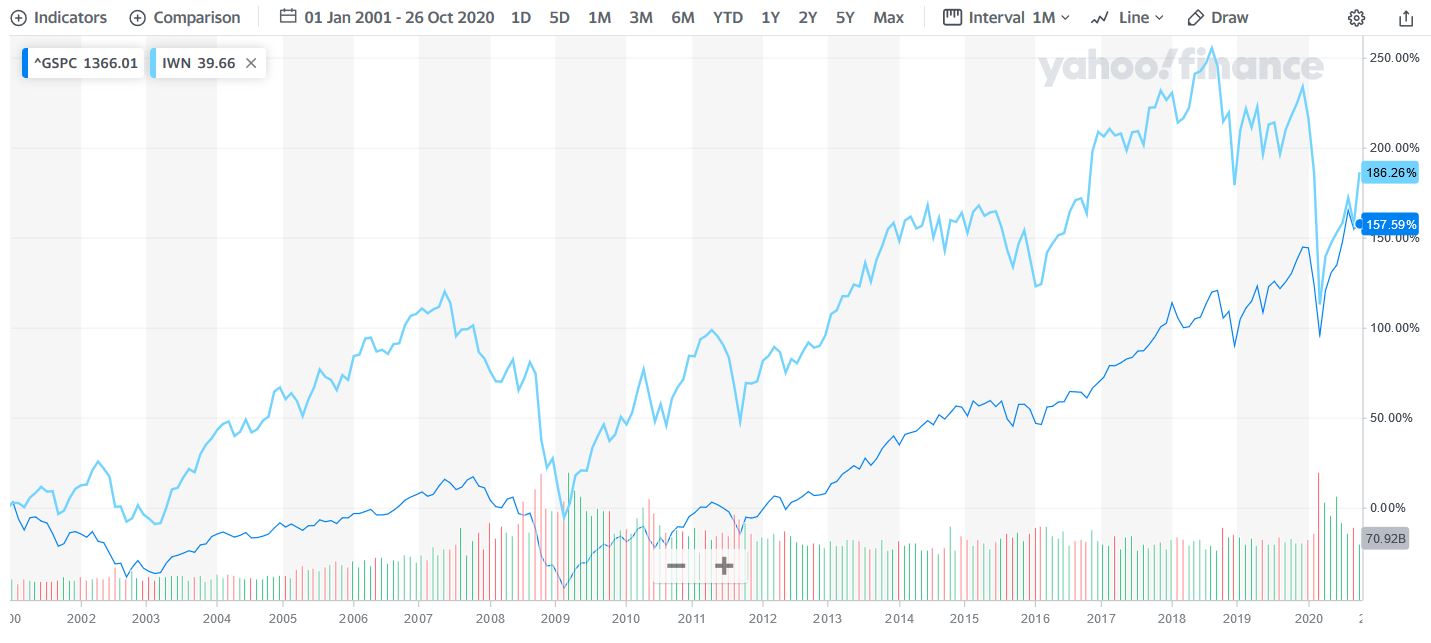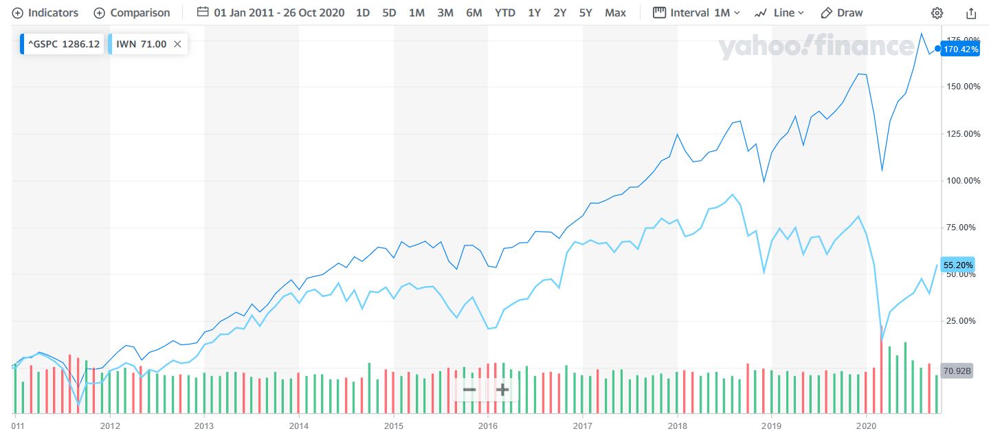 If you look at things over the long run, it’s all fine and dandy. On a twenty-year basis, value stocks (I’m using the IWN ETF here as a proxy), outperformed the S&P 500 by about 30%*.