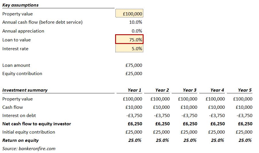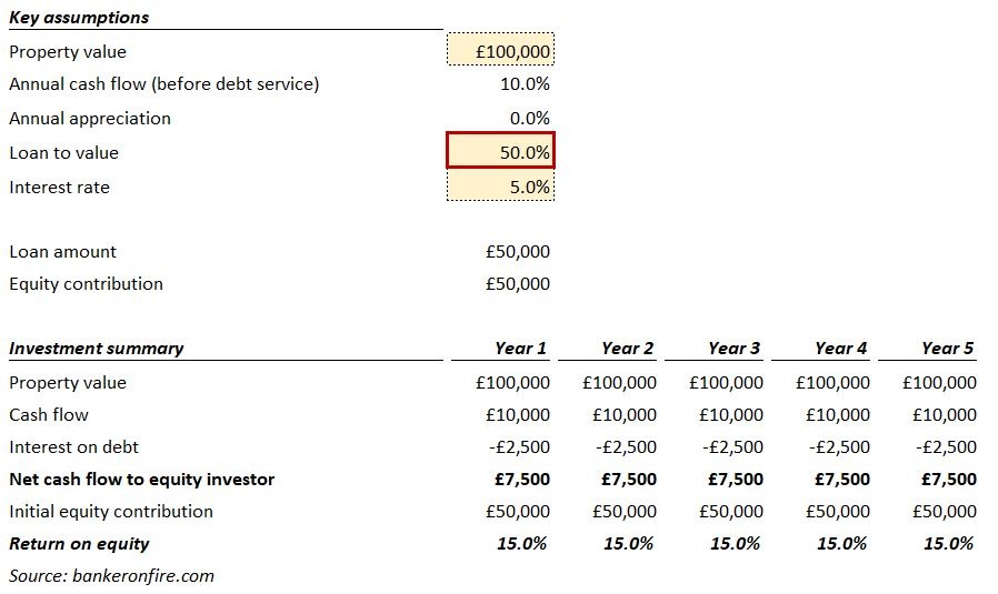 Assume you find a property that costs £100,000, generates a cash flow of £10,000 per year and does not appreciate in price. Also assume you can find a lender who is willing to give you an interest-only, 50% LTV mortgage on it at a 5% interest rate.