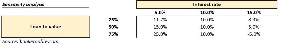 The third column is most striking. It assumes that your debt cost is 5% higher than your cash yield. Unsurprisingly, you are now in a situation where you make less money than the lender – and are even losing money in a high LTV scenario. If you see this situation on the horizon, walk away as fast as you can.